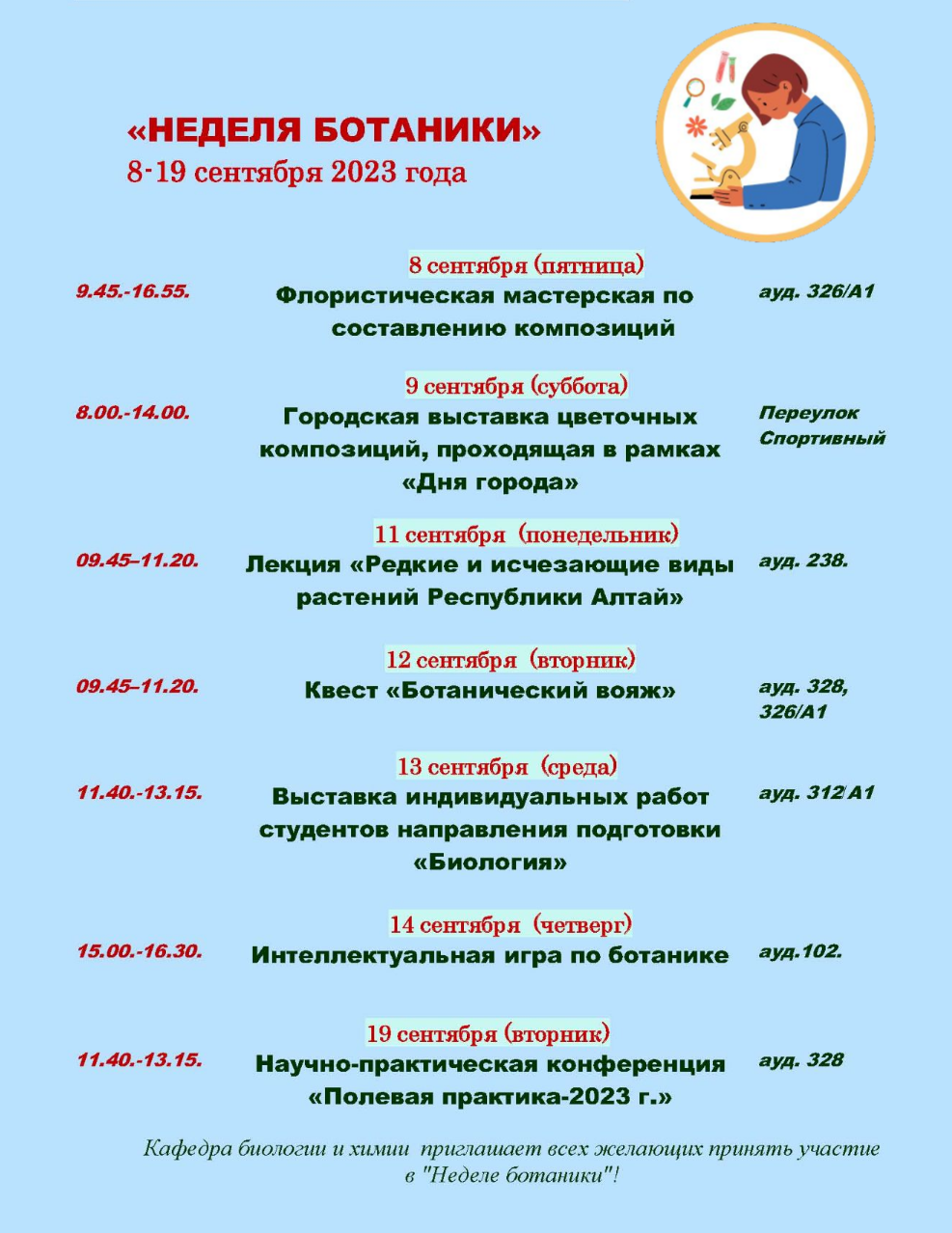 На естественно-географическом факультете с 8 по 19 сентября состоится традиционная «Неделя Ботаники». Программа мероприятий включает флористическую мастерскую, выставку цветов, интеллектуальные игры, лекции и конференцию.