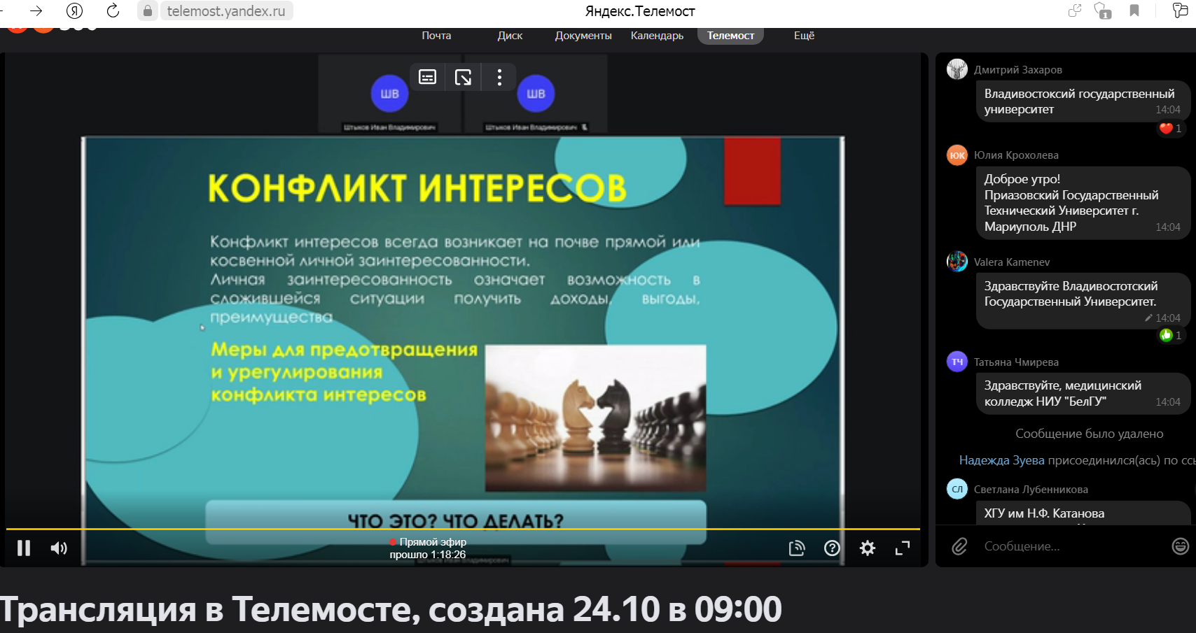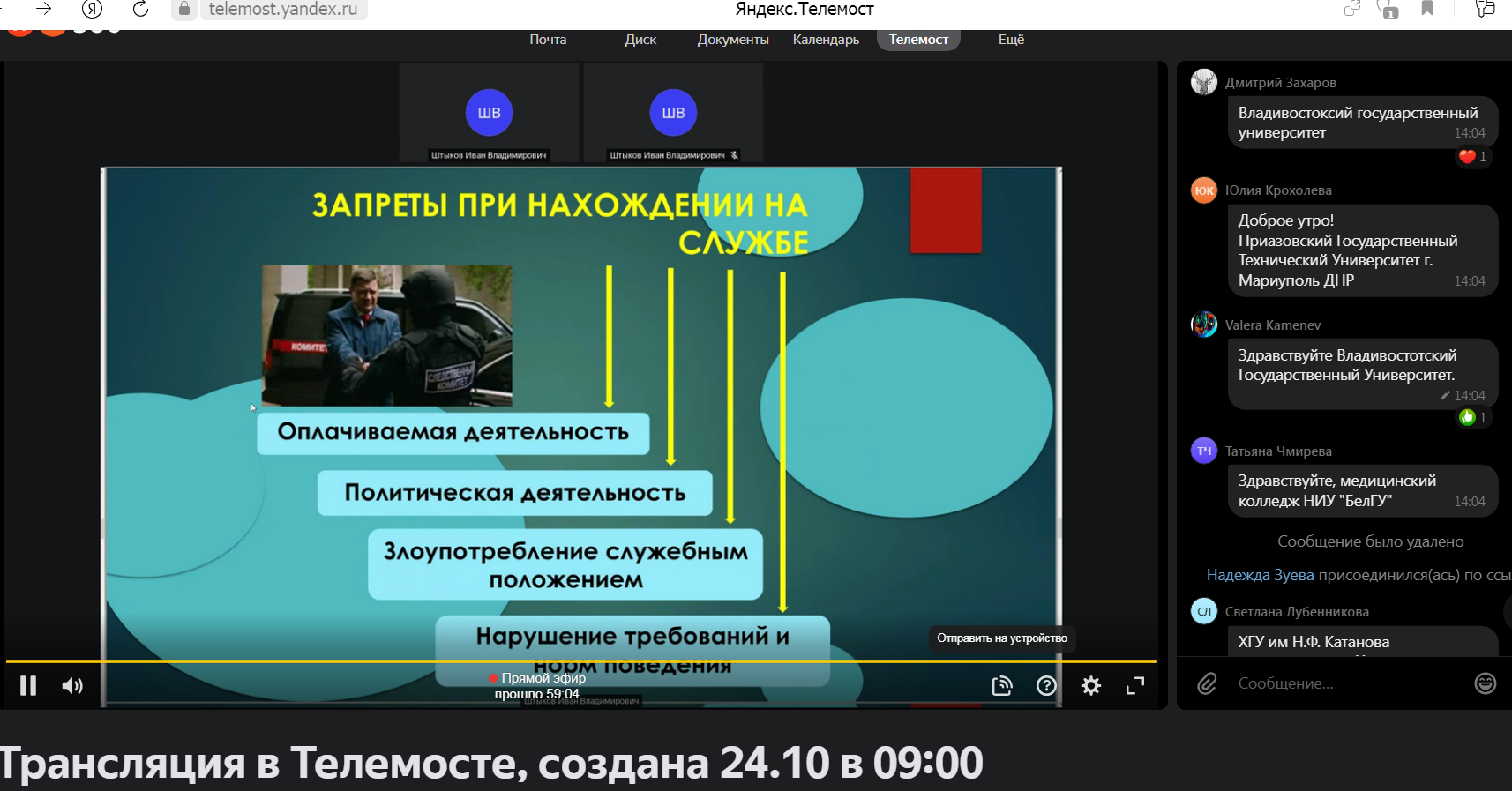 25 октября студенты Горно-Алтайского государственного университета приняли участие в открытой онлайн-лекции «Актуальные антикоррупционные компетенции современного государственного служащего» (антикоррупционная политика в сфере государственного и муниципального управления) на платформе Яндекс-Телемост. Лекция проходила на базе Института государства и права Тюменского государственного университета.