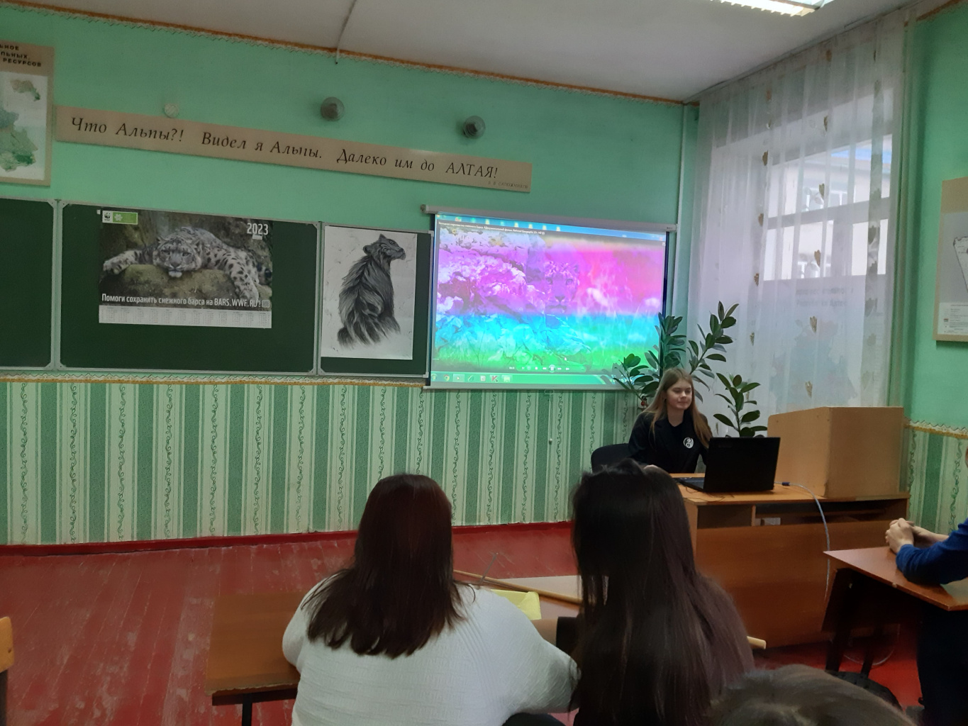 В рамках взаимодействия «Вуз - школа» в МБОУ «СОШ № 8 им. А.Н. Ленкина» члены географического клуба Дарья Барбачакова, Виктория Привалова и Анна Нужнова класса провели беседу и показали видеоролик о снежных барсах для учащихся 7«Б». Ребята увидели, как снежный барс ведёт себя в дикой природе, охотится и отдыхает, как играют между собой котята снежных барсов. Узнали, что снежные барсы не умеют рычать, зато как все кошки могут мурлыкать и издавать тонкие звуки, чем-то отдаленно напоминающие мяуканье.