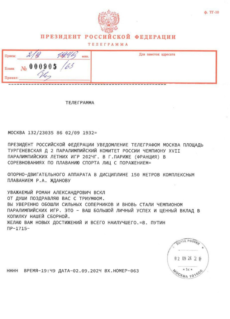В.В. Путин поздравил Р.А. Жданова - чемпиона XVII Паралимпийских летних игр 2024 г. в г. Париже (Франция) в соревнованиях по плаванию спорта лиц с ПОДА в дисциплине 150 метров комплексным плаванием.
