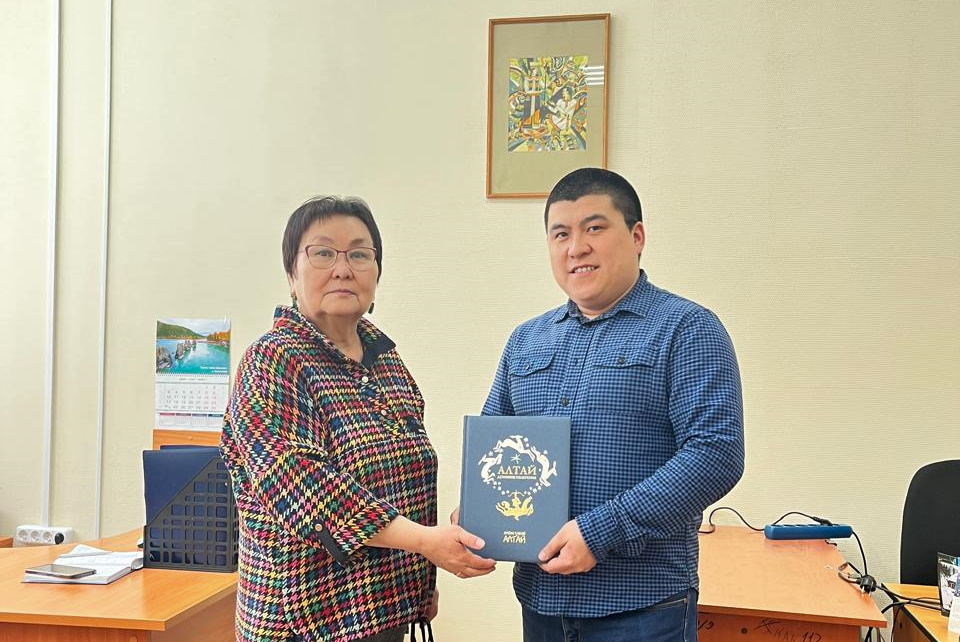 На фото: методист Национальной библиотеки Галина Егоровна Ядагаева вручает победителю приз – книгу об Алтае.