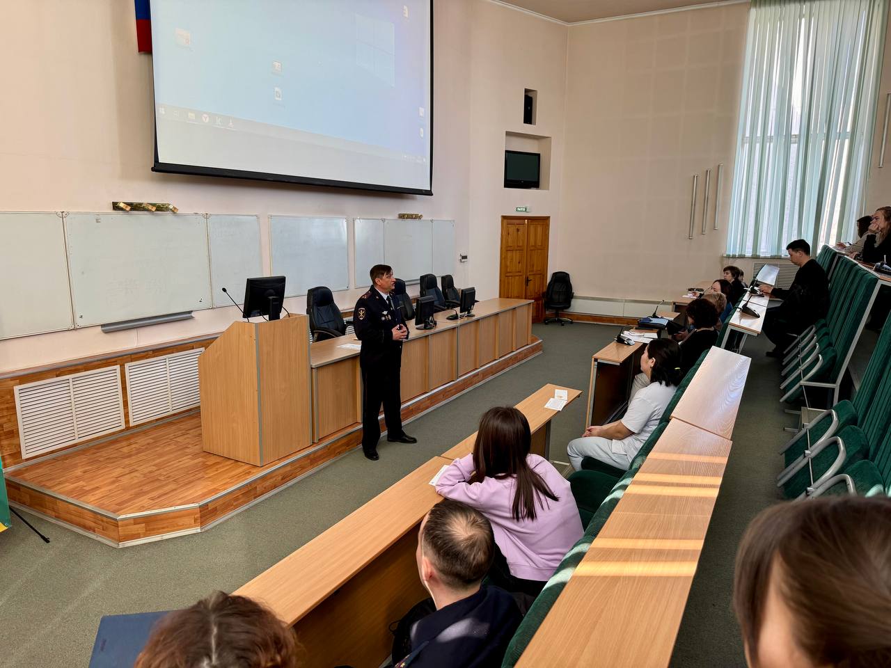 Об актуальных вопросах нашей жизни студентам рассказали представители разных ведомств и организаций. Сергей Владимирович Романов, начальник МВД России по городу Горно-Алтайску, рассказал собравшимся о проблеме мошенничества и о том, как обезопасить себя от него. Председатель Фонда охраны природного наследия Республики Алтай Анна Васильевна Сапарова сообщила новость о создании волонтерского отряда экологов.