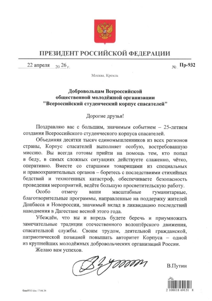 22 апреля свой 25-летний юбилей отметила крупнейшая Всероссийская общественная молодежная организация «Всероссийский студенческий корпус спасателей».